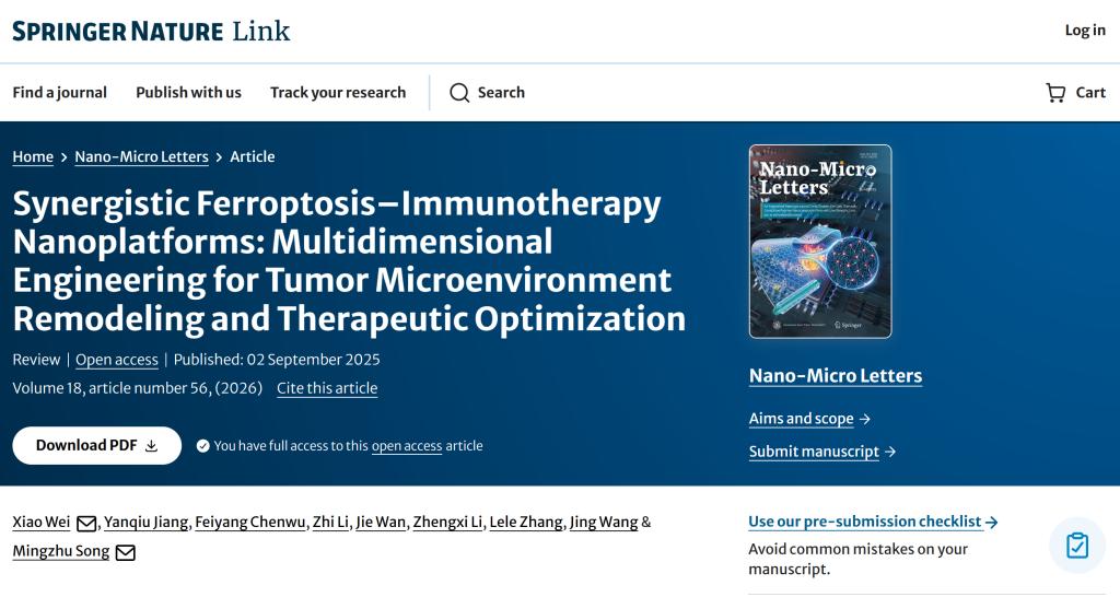 基础医学院本科生首次在“Nano-Micro Letters”国际顶级期刊上发表学术论文近日,由基础医学院魏枭、宋明珠两位老师共同指导的来自临床医学专业2023级的本科生江焱秋、陈伍飞扬、李正熙,护理专业2022级的本科生万杰,临床医学专业2021级的本科生李智同学的研究成果在中科院一区,JCRQ1区国际顶级Top期刊 Nano-MicroLetters 上在线发表,该期刊最新影响因子(2024-IF=36.3)。这也是学校首次有本科生在此期刊上发文。该论文主题为"SynergisticFerroptosis–ImmunotherapyNanoplatforms:...052025-09