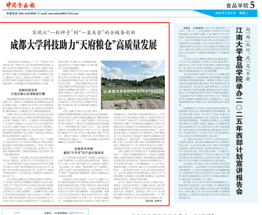 5月6日出版的《中国食品报》第5版食品学院版以《实现“一粒种子”到“一桌美食”的全链条创新 凯发k8官网科技助力“天府粮仓”高质量发展》为题,报道我校主动服务国家战略需求,以农业学科为支撑,以科技创新为引领,以成果转化为抓手,聚焦杂粮科技攻关、农产品加工和绿色农业等领域,以科技助力农业发展,为加快建设农业强国贡献成大力量。