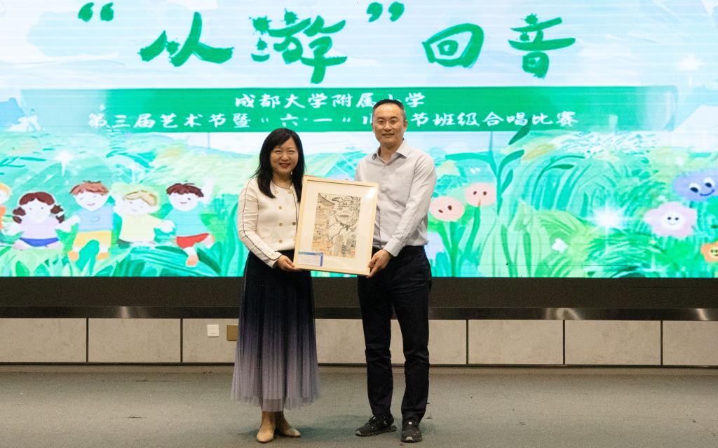 一走进附属小学,孩子们热情地邀请校领导合影。慰问期间,正是附小第三届艺术节暨“六一”儿童节班级合唱比赛活动时间。校领导来到学术报告厅,与师生们一同欣赏附小“爱橙”管乐团演奏的《超越》《成长的礼赞》和“余音”合唱团演唱的《住在心里的人》。校领导为学生代表赠送节日礼物“三大球”,为孩子们送上节日的祝福。附属小学负责人回赠学生书画作品《未来·智能AI灭火机器人》。校领导还参观了从游书院。