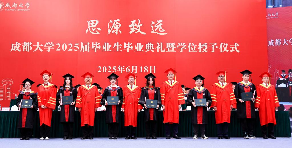 党委书记刘强为2025届四川省优秀大学毕业生代表颁发荣誉证书。党委副书记、校长朱明以“坚定坚强坚守坚持在坚韧中成长”寄语毕业生。