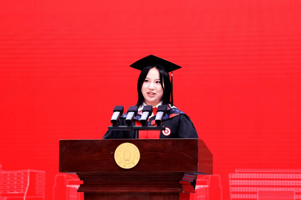 斯特灵学院首届毕业生、网络与新媒体专业钮芷莹同学作为毕业生代表发言。她分享了自己毕业论文的致谢内容,向大学初进校时遇到的热情帮助自己的志愿者致谢,而当自己成为大运会志愿者时,感受到了成大的温度在接力,这是青春最温暖的注脚;向自己随身携带,记录了自己成长,找寻到热爱的笔记本致谢,纸页上镌刻上新闻人接力棒的纹路;向大学期间鼓起“第一次”的勇气致谢,勇气的背后是被学校、学院托举的底气。而那些迈出的“第一步”,已铺就成坦途。