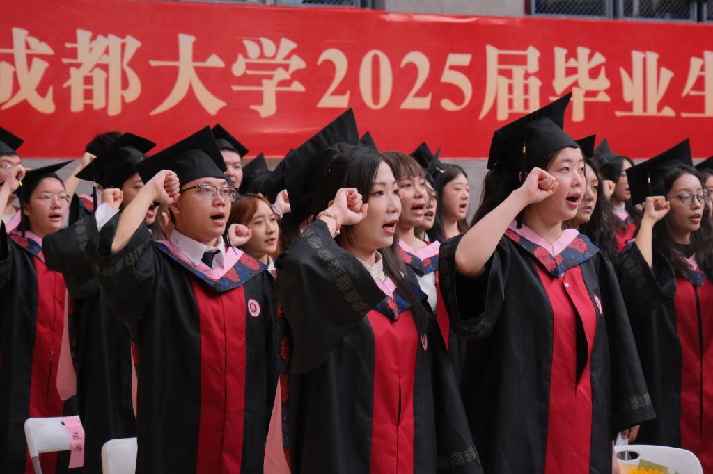 2025届毕业生代表、药学院研究生吴磊同学带领全体毕业生宣誓:“我立志成为,堪当民族复兴重任的时代新人,立大志、明大德、成大才、担大任!……”现场全体毕业生紧握右拳,郑重承诺。