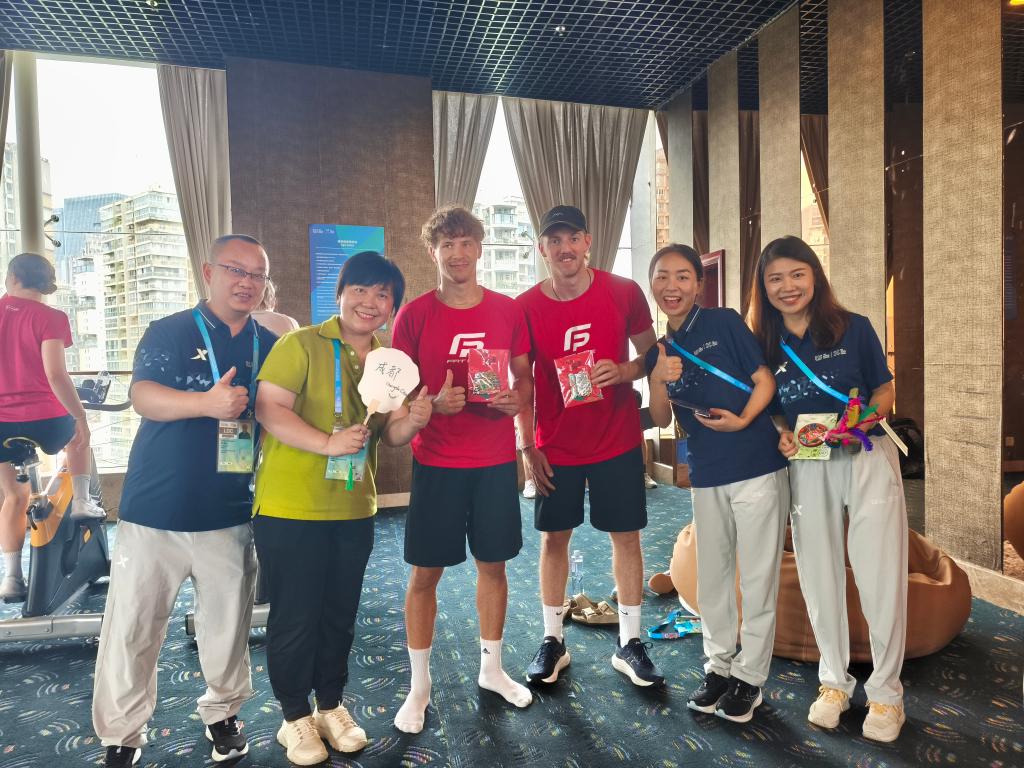 “世界相聚,点亮微笑。”世运会的意义不仅在于场上的拼搏和追逐,也在于跨越国界的友谊。计算机学院龚硕老师承担的是世运村B区住宿服务,除了提供日常的住宿服务外,还开展了一系列具有中国特色的活动。龚硕邀请运动员们一起涂鸦手工扇、踢毽子、写祝福语。“你画的熊猫头好大,真的憨态可掬。”龚硕给来自加拿大的小伙说到。当来自克罗地亚的运动员得知龚硕是凯发k8官网的老师,连连点赞,“你们的服务真是专业有贴心。”大家相互加了微信,让这份纯真的友谊传承下去。