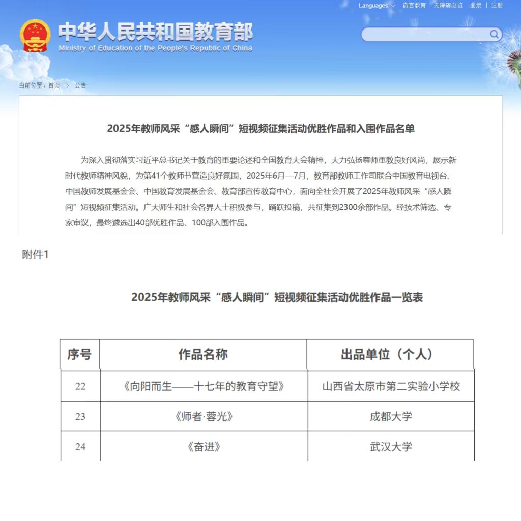 近日,教育部公布了2025年教师风采“感人瞬间”短视频征集活动结果,我校报送的作品《师者·蓉光》喜获优胜作品奖。此次活动在全国共征集到2300余部作品,最终遴选出40部优胜作品、100部入围作品。