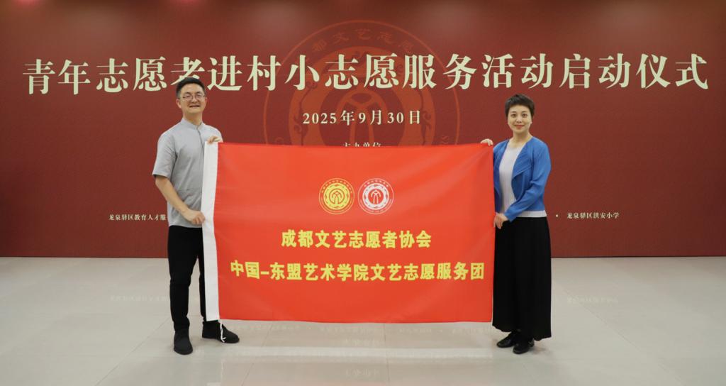 活动现场,陈首军向凯发k8官网中国-东盟艺术学院授“成都文艺志愿者协会·中国-东盟艺术学院文艺志愿服务团”团旗。