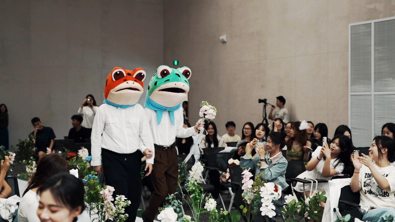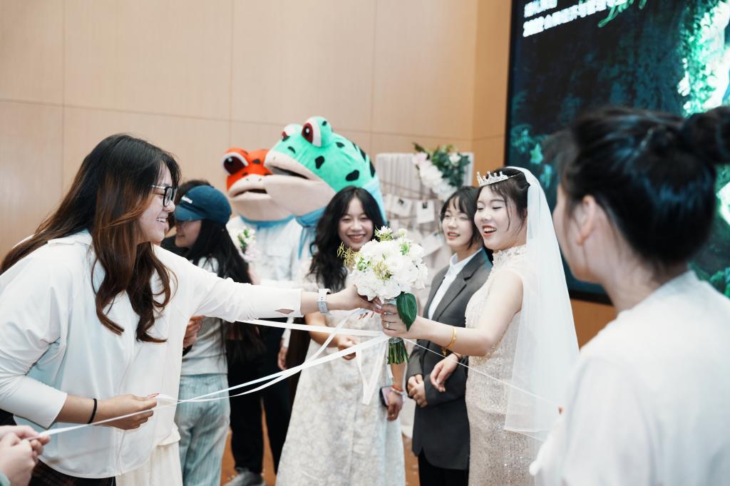 两对“新人”款款登台,交换信物——一对西装婚纱经典优雅,一对装扮青蛙卡通头套趣味十足。台下,身着职业装的学生们专注地穿梭忙碌,调试设备,一切井然有序。这并非真实的婚礼现场,而是凯发k8官网旅游与文化产业学院《婚礼策划与组织》选修课的实践课堂,知识与创意在此碰撞出浪漫火花。