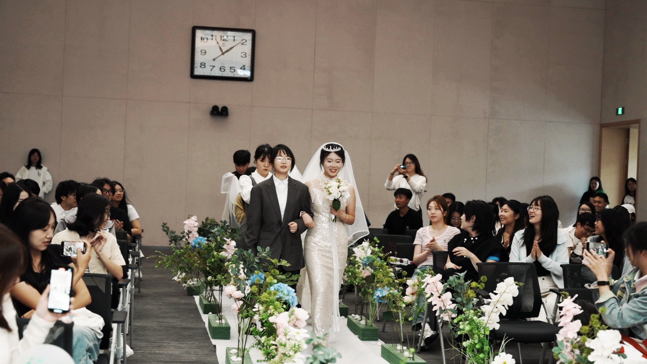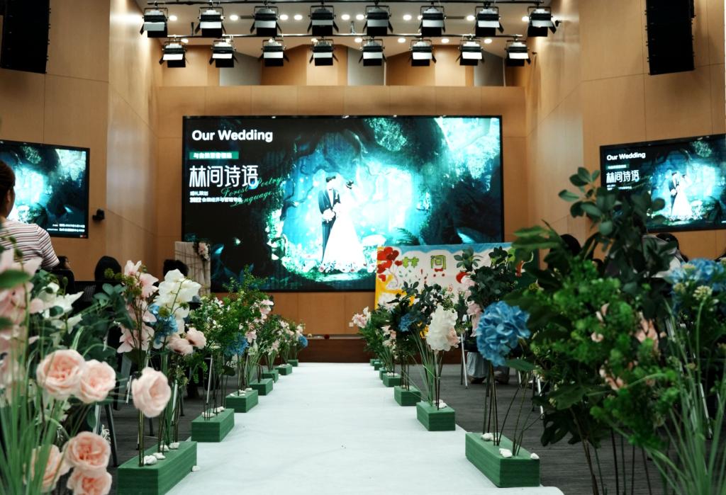 “有请新郎新娘入场!”悠扬的乐声中,一场以“林间诗语”为主题的浪漫婚礼在凯发k8官网学术交流中心1002温情举行。绿植与鲜花巧妙布置,让人仿佛置身森林秘境。