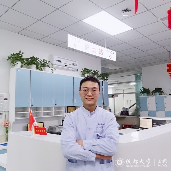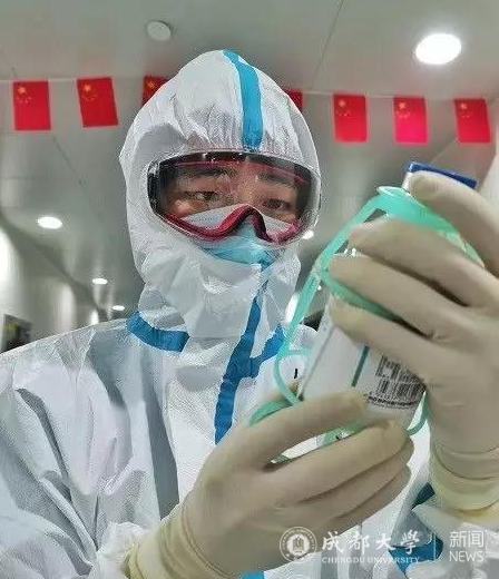 成大附院第二批援鄂医疗队临时党支部书记、护理组长、神经内科护理负责人刘天衡是2009级护理学专业校友,是科室护理工作的核心人物,也是男护士工作站的中坚力量。他乐观豁达,工作上事无巨细。抵达武汉后,由于大家都没有进入过隔离病房,也没有相关经验,刘天衡站出来说:“我们是党员,我们先上”。随即,他便带领几名医疗队的党员同志进入隔离病房熟悉环境布局,了解工作模式和流程。学习完毕,他详细的对医疗队其他队员进行培训,强调注意事项,为医疗队顺利开展工作积累经验,贡献共产党员力量。进入病房的当天,几乎26小时滴水未进,但他说道:“作为党员,作为临时党支部书记,就应该为大家做好一切服务” 。