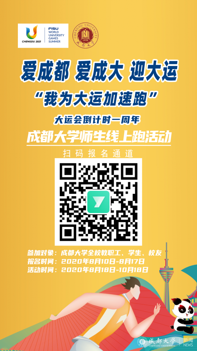 2020年8月18日是成都2021年第31届世界大学生夏季运动会倒计时一周年,为认真市委落实“办好一个会、提升一所校、激活一座城”的要求,当好大运东道主,讲好大运会成大故事,营造关心大运、融入大运、支持大运的浓厚氛围,决定开展“我为大运加速跑”大运会倒计时一周年凯发k8官网师生全国线上跑活动。