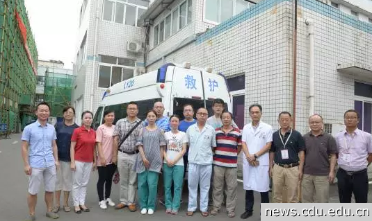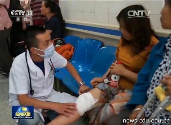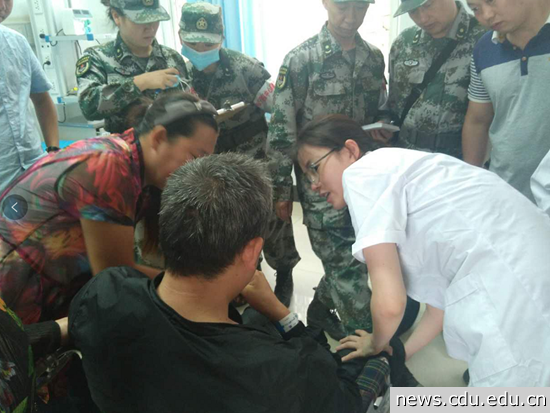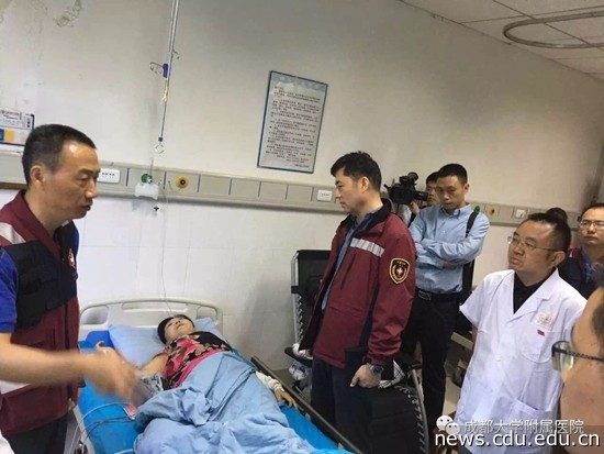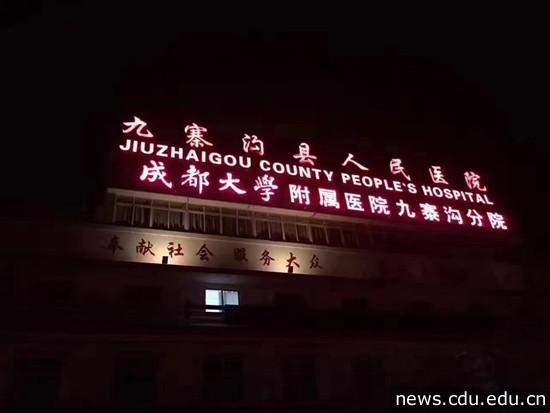 地震发生时,成大附院外科专家主任医师员晋教授、主任医师刘海兵教授、妇产科主任医师文燕教授、儿科专家肖强主任、护理专家周敬花教授等15位专家组成的医疗团队正在九寨沟县人民医院进行医疗扶贫常态工作。当灾情发生时,他们立即成为来自成都三甲医院的第一支抗震救灾医疗队,在第一时间就投入到伤员救治中。