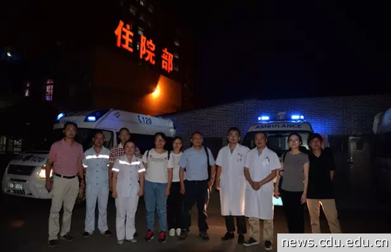 8月9日12点8分,接成都市卫计委应急办通知,九寨沟风景区九道拐以下有150名左右游客被困,10多人受伤,现场只有两名九寨沟县医院医护人员,急需降压药品和外伤药品。医疗副院长李世云又带队,由成大附院胸心外科主任医师金健教授、骨科主任医师汪学军教授、神经外科副主任医师陈世平副教授、泌尿外科岐宏政主治医师等组成临时突击队,带着装备徒步前往救援,沿途塌方严重,道路两边不断有大量山石滚落,成大附院医疗突击队队不顾生命安全,徒步闯过塌方路段,挺进震中,为抢救生命争取宝贵时间。最终,医疗队沿途救治了多名游客。