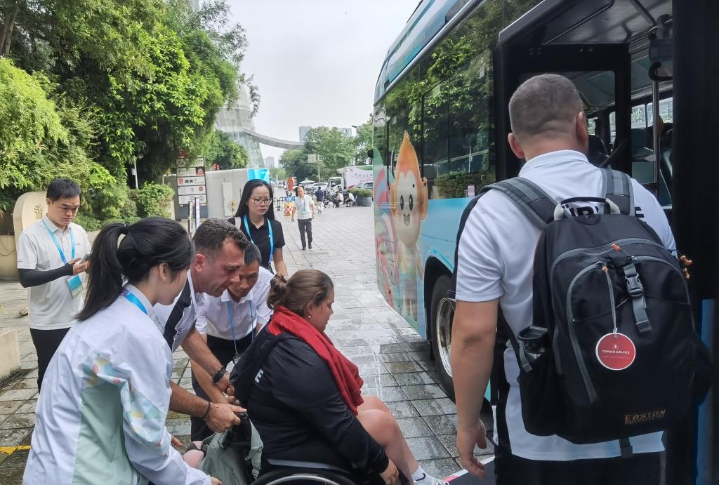 在交通调度岗中,志愿者协助行动不便人员乘车,提供贴心引导与帮扶,保障参会人员顺畅出行,以专注守护出行秩序,助力赛事交通顺畅。