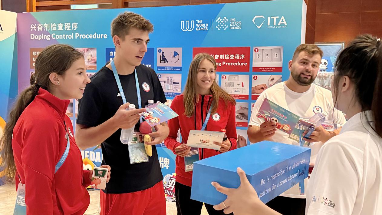 在反兴奋剂岗,志愿者围绕兴奋剂检查展板,用游戏互动形式,向运动员递资料、分享物品,趣味传递知识,助力了解规则,传递赛事服务温度。
