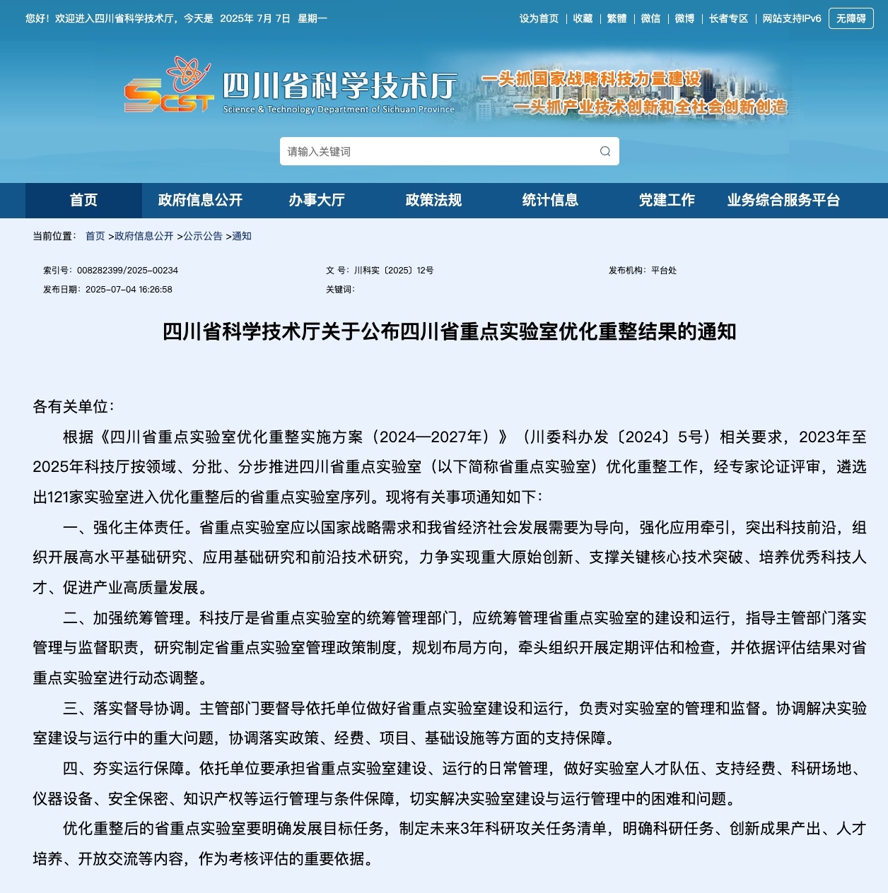 7月9日,记者从四川省科技厅获悉,《四川省重点实验室优化重整结果的通知》已于日前对外公布,最终遴选出121家实验室进入优化重整后的四川省重点实验室序列。同时,四川省在人工智能、深地科学、文化科技融合等新兴和优势领域新建7家实验室。