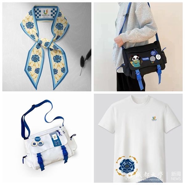 马丽娃团队不仅参与了绶带设计,还进行了周边文创产品的设计。成大艺术设计专业视觉传达方向研究生杨一鸣,参与组织协调团队成员进行蜀锦的文献研究、实地考察、草图绘制、创新应用等工作,与同门学姐张如禹一起设计了蜀锦奖牌绶带工装斜挎包,以及大运会熊猫体恤等文创产品,投入市场后反馈火热。