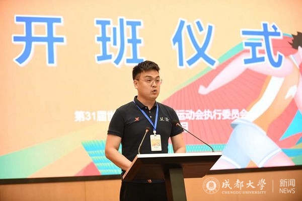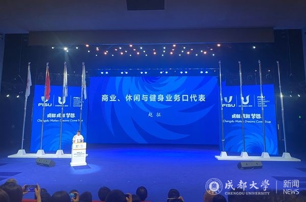 7月18日上午,成都第31届世界大学生夏季运动会运动员村开村誓师动员大会举行。来自大运村9个业务口的工作人员代表分别上台发言,表达了“勇于担当、甘于奉献”的精神。赵征作为商业、休闲与健身业务口代表向大家介绍了本业务口工作筹备情况。