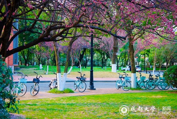 翠绿生机映衬着点点粉意,排列整齐的自行车尽显春日光景