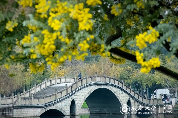 桥边的树木郁郁葱葱,金黄的花朵宛若繁星洒落
