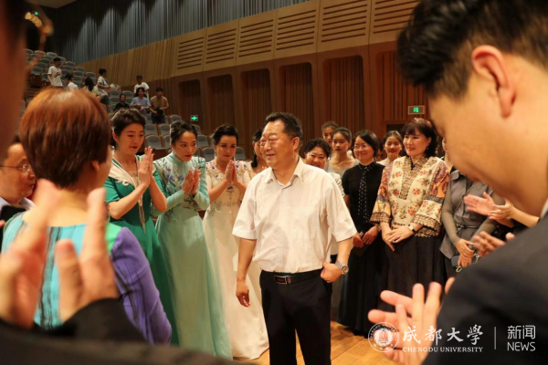 胡秀强在观看了音乐会后,肯定了学院主题教育启动以来取得的成绩,强调此场红色经典传唱音乐会主题契合了学校党委学习贯彻习近平新时代中国特色社会主义思想主题教育,学院师生党员从学习中铸练党性,从演出中锤炼本领,在主题教育活动中汲取源源不断的前进动力,并通过“音乐厅里的思政课”来落实立德树人根本任务,为党培养文艺人才。同时,学院师生还将参加第31届大运会开村仪式演出和运动员欢送专场主题演出,师生们将以主题教育为动力,挥汗排演,力出精品,不辱使命。