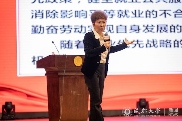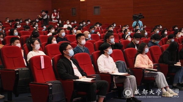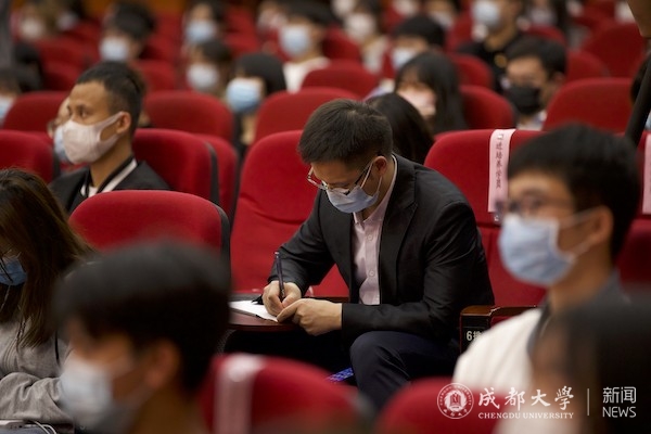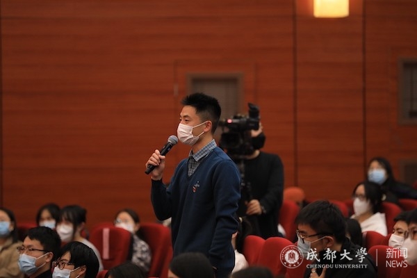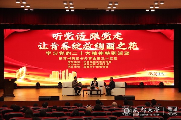 在与现场观众交流互动,针对同学们关心的“大学生应先就业还是创业 ”“大学生如何破除压力,承担新时代的历史使命”“如何才能树立正确的人生观和奋斗目标”“如何理解和把握生逢其时的‘时’”等问题,两位嘉宾逐一作答交流,解疑释惑。活动尾声,两位嘉宾深情寄语青年:“要秉持‘自爱、自修、自尊、自强’的成大校训,自信自省、自警自励,把党的二十大精神学深悟透、融会贯通,成为全面建设社会主义现代化国家的先锋力量”。“要坚定不移听党话、跟党走,怀抱梦想又脚踏实地,敢想敢为又善作善成,立志做有理想、敢担当、能吃苦、肯奋斗的新时代好青年”。现场嘉宾还向学生赠书《党的二十大报告辅导读本》。