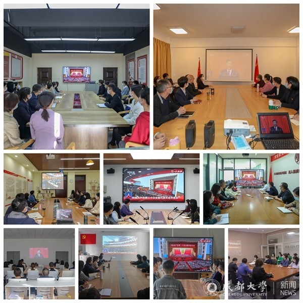 随着庄严的国歌奏响,现场观看人员全体起立,高唱中华人民共和国国歌。在行政楼501会议室,学校全体党委常委、党委职能部门负责人聚精会神收看开幕会直播。学校处级干部,民主党派、统战团体负责人,职能部门、直属业务部门科级干部,各学院党政办主任,辅导员,学生骨干代表踊跃收听收看开幕会直播的热烈场面,认真聆听习近平总书记的报告,认真记录报告内容,近两小时的现场直播,大家始终全神贯注,边聆听边思考,热烈的掌声阵阵响起。