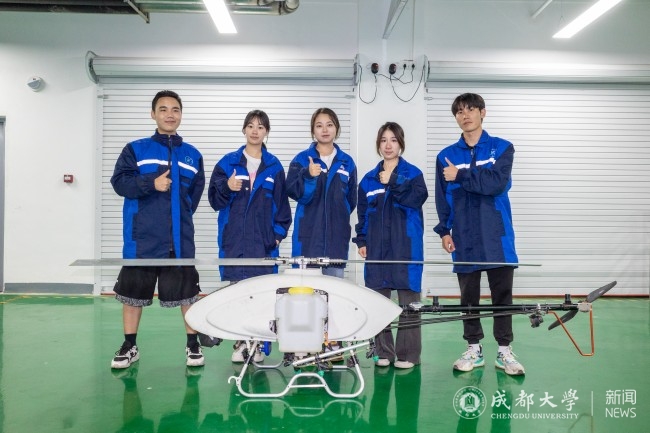 “面对这样一群有理想的学生,就需要老师们更加的努力支持。”建筑与土木工程学院姚远老师、食品与生物工程学院向达兵老师聚焦这一难点,带领学生团队三年磨一剑,自主研发出一款新型植保无人机软硬件一体化装备。“这款植保无人机可以喷洒施药,还能进行撒肥、撒种、撒饲料等多种工作,特别是在山区复杂地形条件下,能够满足农户多样化植保作业需求,提高生产效率。”
