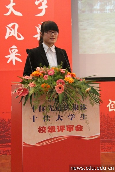 “十佳”候选班级代表和“十佳”个人在八分钟展示(演讲)内,辅以生动的PPT视频,自信自豪地向老师和同学们汇报了所在班级或个人一学年来拼搏奋进、学习成才、全面发展的情况和成绩。信息科学与技术学院邓敏同学以“奋斗的青春谱写生命的乐章”为主题的演讲,情真意切,催人奋进;外国语学院杨光钰同学以独特的视角,将自己父母期望,离家求学,一步步成长的经历展现给大家;工业制造学院邓丽娟同学用自己的奋斗经历和切身感悟,再次向大家诠释了“巾帼不让须眉”的涵义;文新学院李诗琴同学一句“‘自爱、自修、自尊、自强’的校训赋予了我成长的灵魂”让人感受到成大精神。电子信息工程学院09电子信息工程一班“同一个家,同一个梦想”的口号,既温馨又给人力量;信息科学与技术学院10级软件班带着“77颗真诚的心”、“77种特别的理想”、“77种坚定的信念”,在成大起航;医护学院10级护理3班同学宣读誓词 “用我天使之纯白,呵护生命之多彩”,庄严而圣洁,那一刻,她们不仅感动了自己,也感动了在场的所有师生。