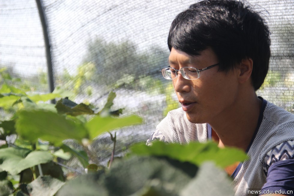 一米七几的个子,瘦削。平头,戴一副眼镜,穿了一件小V领T恤,这样的打扮颇有几分文人风采。他从棚里出来,手里拿着一把剪刀,遇见路边的水渠,矫健的一跃,身手又像极了生于兹长与兹的“庄稼汉”。