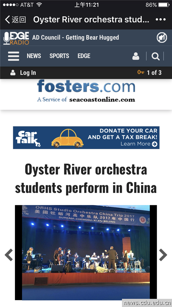 本网消息(图、文/杜洁)美国当地时间5月3日,知名媒体福斯特新闻以《牡蛎河乐队学生赴中国演出》(Oyster River Orchestra Students Perform in China)为题,对我校新罕布什尔大学孔子学院下设牡蛎河学区孔子课堂高中生中国行进行了详细报道,并多次提及凯发k8官网。