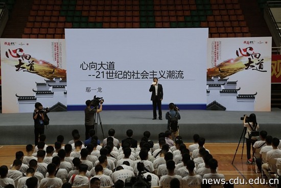 本网消息(文/启金 图/简易)9月24日下午,在中共成都市委宣传部指导下,纸鸢书院第七话《心向大道》大型读书分享交流会在我校体育馆隆重举行,畅销“红色书籍”《大道之行》作者、清华大学博士、“圆明园学者”获得者鄢一龙与我校1600余名师生一道分享和交流了对坚持走中国特色社会主义会“大道”的认识和感悟。市委宣传部副巡视员唐学、我校党委副书记宋辉出席现场活动。活动由成都电视台承办,知名主持人张毅担纲主持。