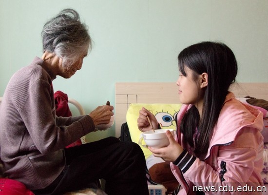 思考良久,刘琳做出了一个让所有人都吃惊的决定——她要带着奶奶上大学。她当然知道这个决定意味着什么:她必须对93岁高龄的奶奶的健康负责,不能有一丝懈怠;她得牺牲很多宝贵的大学时光,牺牲很多个人时间与空间。“百善孝为先。从小奶奶一点点把我带大,现在奶奶身体不好,照顾她就是我的责任,是我目前最重要的事情。”刘琳坚定地说。
