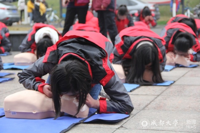 “记住要领,双手十指相扣,掌根重叠,掌心翘起,紧贴胸膛……”我校附属医院急诊科专家梁隆斌从模拟操作开始,向同学们讲解掌握应急知识、开展应急心肺复苏的重要意义,然后从及时发现患者、做好现场救援人员自身防护安全、判断患者意识和呼吸、寻求帮助、呼救、观察患者体位,到胸外按压、开放气道、人工呼吸等抢救流程进行了详细讲解。急诊医学科老师黄洋辉和何荷现场演练了胸外心脏按压、人工呼吸等应急救护时伤者的体位和救护操作方法,随后现场100位学生两两搭配进行现场模拟操作。成都市急救指挥中心应急培训科科长苗挺为同学们演示除颤仪的操作步骤,并邀请三位学生模拟在专业急救医疗人员接手前现场第一目击者急救操作演练,现场传授急救技巧。