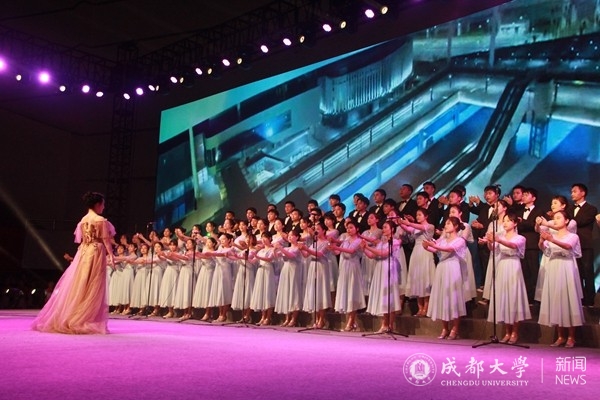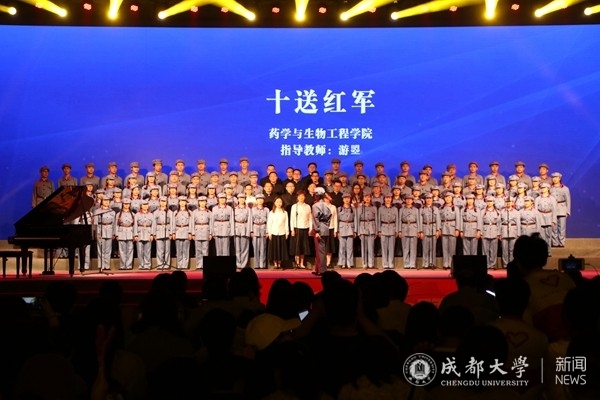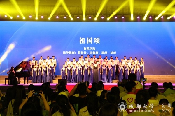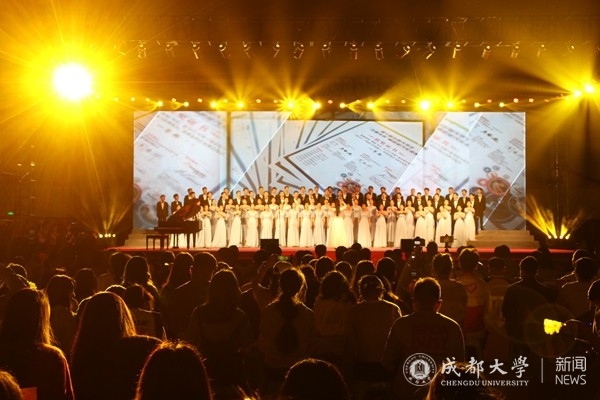 来自16个学院的师生合唱队演唱了《我爱你中国》《十送红军》《走向复兴》《祖国颂》《中国军魂》《国家》等经典爱国曲目,带领大家走过历史的长廊,赞颂中华儿女万众一心、艰苦奋斗的艰辛历程和祖国建设的辉煌成就,唱响成大青年、成大人对党和国家的真挚热爱,一道道蓬勃向上、昂扬奋进的青春力量在体育馆内外激越荡漾。